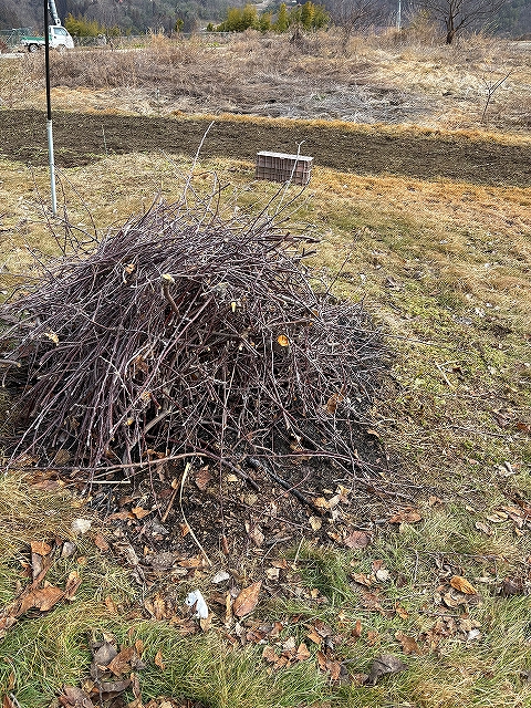 1本の木で大体これくらいの剪定枝が出ます。細かい枝は、焚き付けにすればよいのでしょうが、それを作る時間がなかなかとれないので結局園内で燃やすことになります。冬場は、乾燥しているので野火に気を付けながら処分してます。